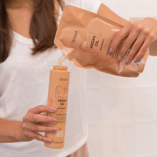 TEKNIA Argan Oil pack contiene: Champú Argan Oil 300ml + Champú Argan Oil 600ml recarga eco + bolsa sostenible de regalo