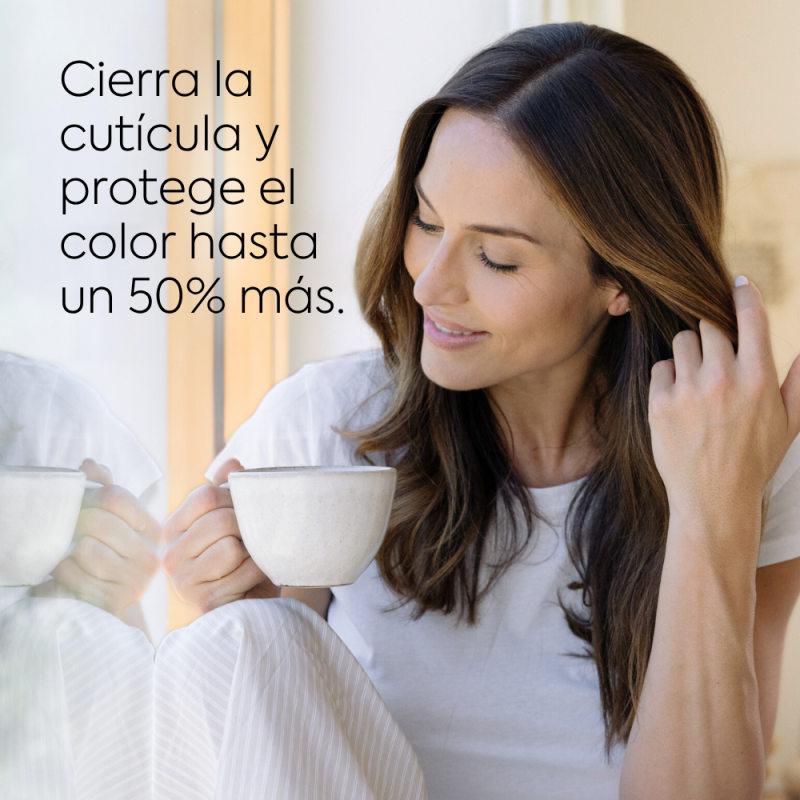 Libre de sulfatos. Su pH ácido cierra la cutícula del cabello manteniendo la tenacidad del color. Prolonga las cualidades del color y retarda la pérdida de pigmentos. Acción antioxidante.
