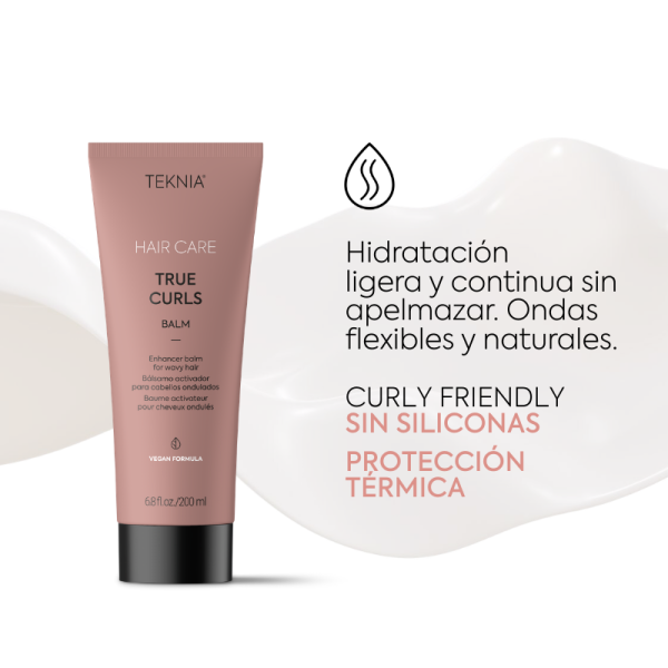 Bálsamo activador de ondas leave-in Teknia True Curls. Ideal si buscas definir y potenciar tus ondas naturales, aportando hidratación ligera y control del encrespamiento. Perfecto para una rutina profesional que deja el cabello suelto, brillante y con movimiento natural.